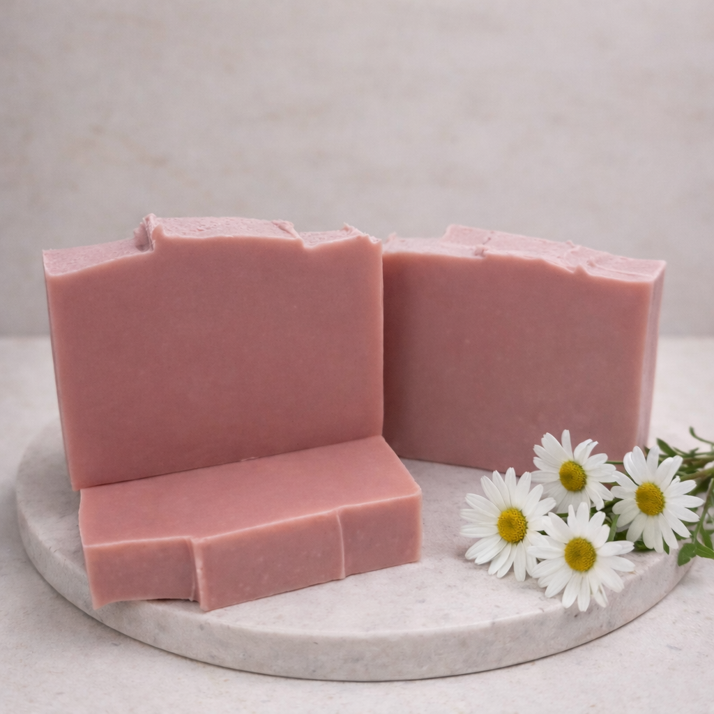 Made with olive oil, lard, coconut oil, palm oil, mango butter, and castor oil, it offers a well-rounded blend of cleansing and conditioning. Mango butter adds a soft, silky richness, while rose clay gives the bar a smooth feel and a natural, warm tone.
